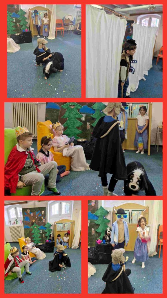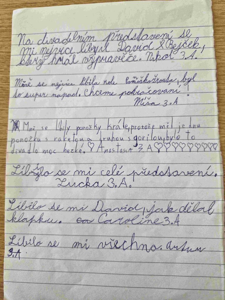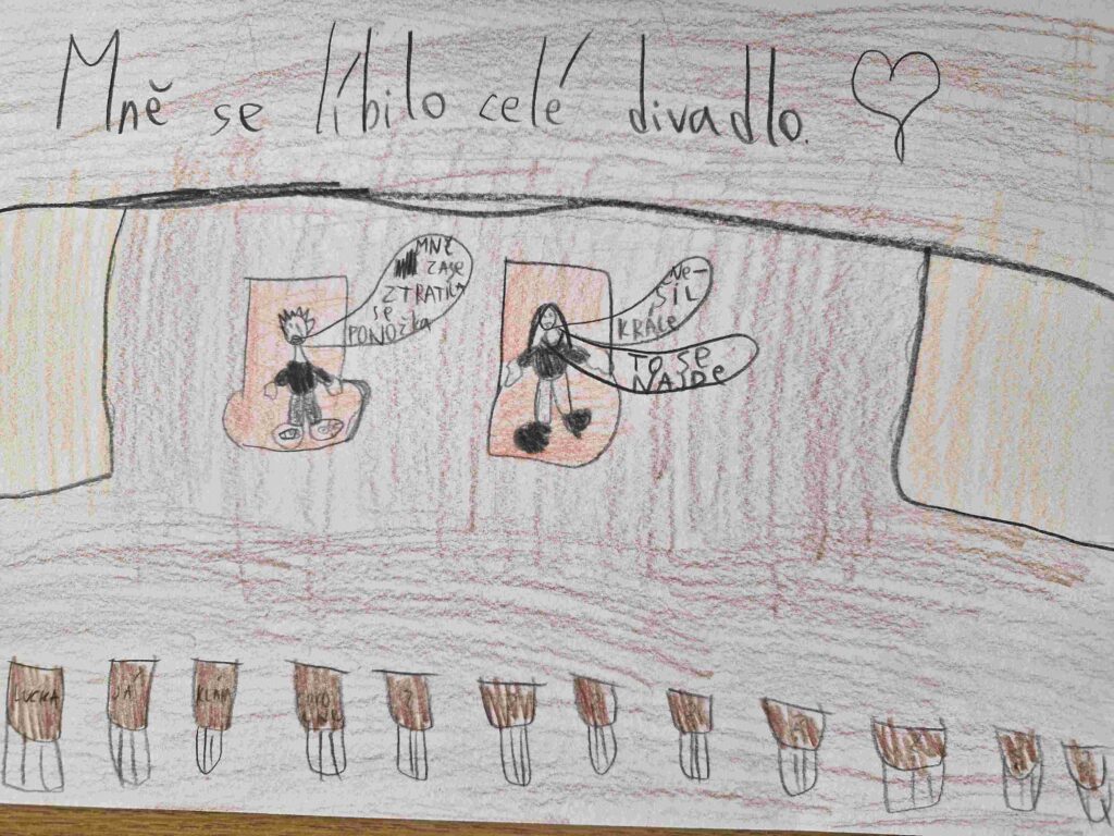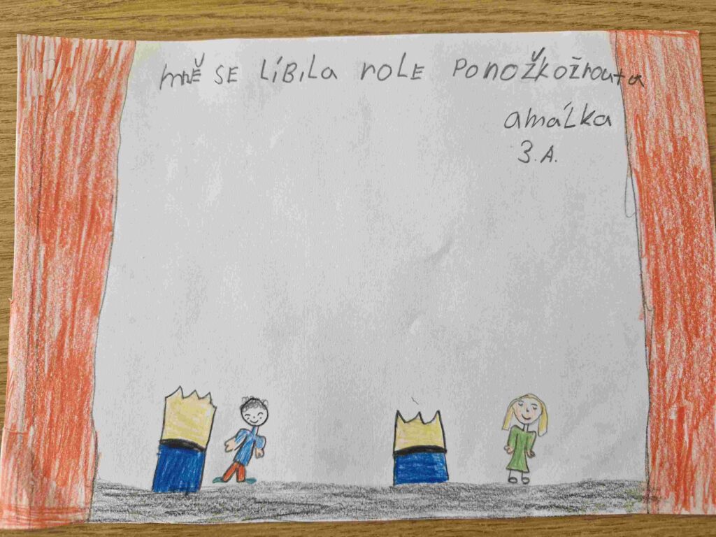 Ve čtvrtek 19. 3. herci z dramatického kroužku zahráli pro všechny děti z našich devíti oddělení družin divadelní představení pod názvem “Království ztracených ponožek.” Představení jsme hráli třikrát, aby nás mohli vidět všichni. Děti si s radostí samy připravily scénář a některé kulisy. Divadelní hra nás moc bavila. Děti si užily její nácvik a při trénování jsme se u toho i dost nasmáli. Závěr divadelní hry jsme zakončili společnou písní, jejíž text jsme si složili sami.