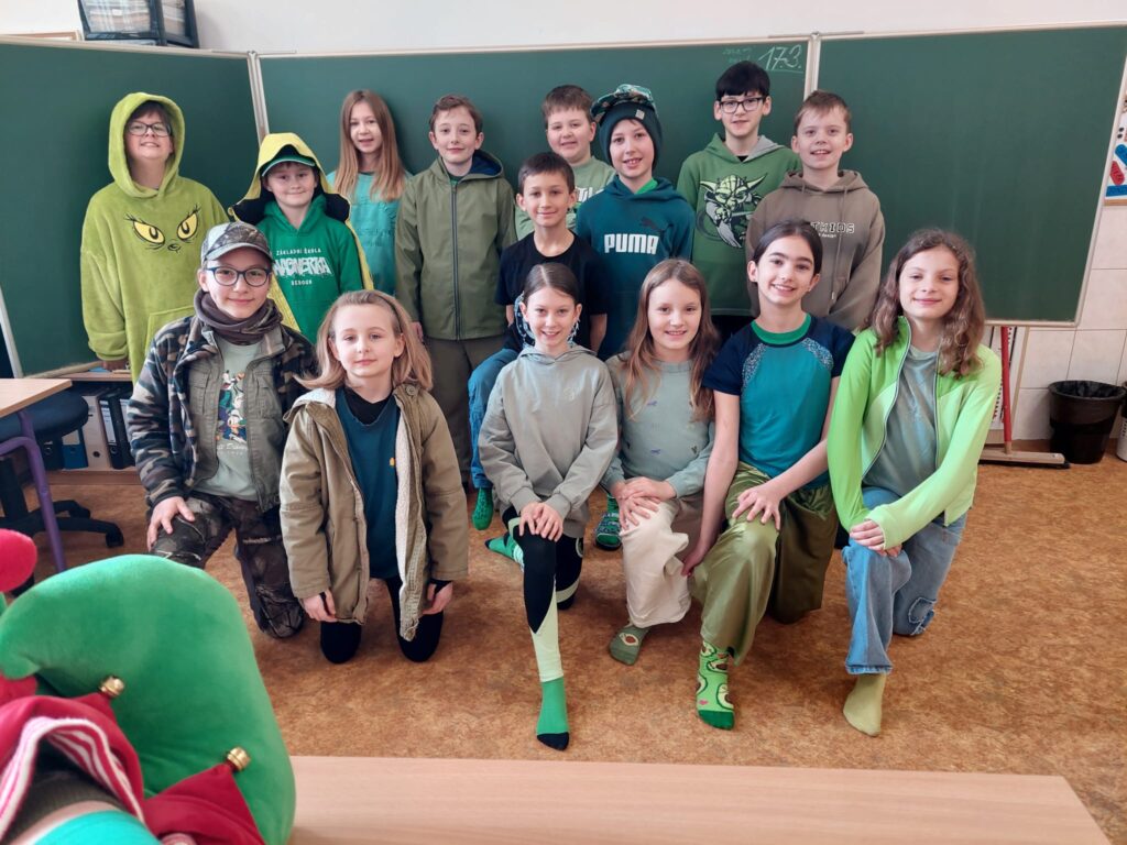 V pondělí 17. března jsme na naší škole oslavili Den svatého Patrika. Žáci i vyučující dorazili v zeleném oblečení a za každý kousek zelené získávali body. Vítězné třídy z prvního a druhého stupně si odnesly sladkou odměnu – snídani od paní ředitelky.