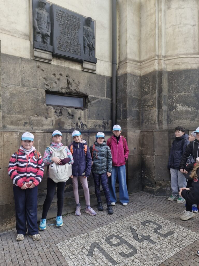 Jeli jsme se třídou vlakem na hlavní nádraží, odkud jsme později šli do Pravoslavného chrámu sv. Cyrila a Metoděje v Resslově ulici, kde nám v 9:OO začala prohlídka hrdinů Heydrichiády. Pustili nám dvacetiminutový dokument a šli jsme se podívat do krypty. Potom jsme šli do metra. Vystoupili jsme na Florenci a šli pěšky do Armádního muzea Žižkov. Tam jsme měli připravený program Po stopách parašutistů. Nad muzeem byl památník na Vítkově, kde nám paní sekretářka udělala fotku. Potom jsme šli zpátky na hlavní nádraží a jeli domů. Výlet se nám velmi líbil.